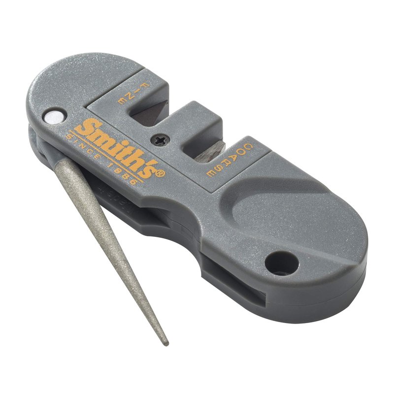 - HANDHELD KNIFE SHARPENER – Smith’s “Pocket Pal” Knife Sharpener features a fold-out diamond-coated rod and preset crossed blades for easy pull-through sharpening. The preset sharpening angles provide guaranteed results on every use!