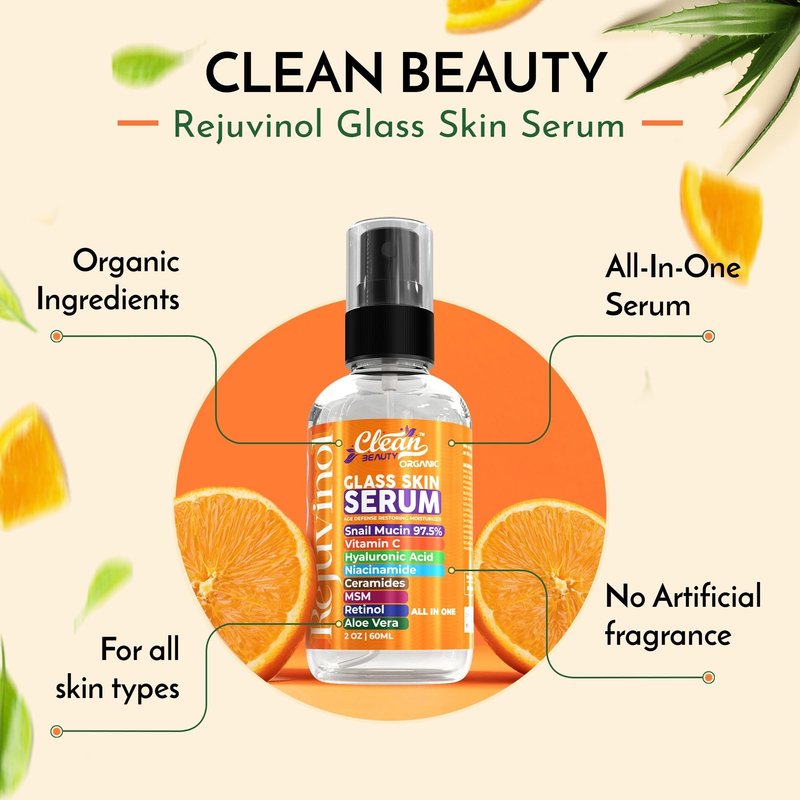 Unlock the secret to ageless beauty with Clean Beauty's All-In-One Rejuvinol Anti-Aging Serum. Crafted with care, this organic glass skin serum caters to both women and men, utilizing a potent blend of Snail Mucin, Hyaluronic Acid, Niacinamide, Ceramides, MSM, Retinol, and Aloe Vera. Dive into a world where signs of aging fade, and your skin's inherent radiance reignites. Its lightweight formula swiftly absorbs, leaving behind a supple, more hydrated, and smoother skin. The serum is enriched with Snail Mucin, a potent ingredient known for its age defense properties and its ability to restore moisture to dry skin. Combined with Hyaluronic Acid, this serum works to improve skin's elasticity, diminish fine lines, and deeply hydrate skin, leaving it soft and plump. Our age defense serum also contains the power of Retinol, a vitamin A derivative that helps to increase collagen production, resulting in a smoother, more youthful complexion. To further support the serum's potency, we have added Vitamin C, a powerful antioxidant, to brighten your skin and deliver a radiant, glass skin effect. Combining anti-aging hyaluronic acid serum, retinol, and snail mucin, it's the epitome of skincare excellence. This serum also includes Aloe Vera, known for its soothing properties, MSM, and Ceramides that aid in retaining moisture. These ingredients work together to provide a comprehensive skin care solution for all skin types, including dry, oily, sensitive, and combination skin. Immerse yourself in deep hydration as it permeates, replenishing and revitalizing your skin from the inside out. Experience the best skin serum for your face with Clean Beauty's Organic Rejuvinol Serum that brings you the ultimate age defense, restoring moisturizer for a glowing, hydrated, and ageless beauty. It's time to embrace a skincare routine that truly cares for your skin.