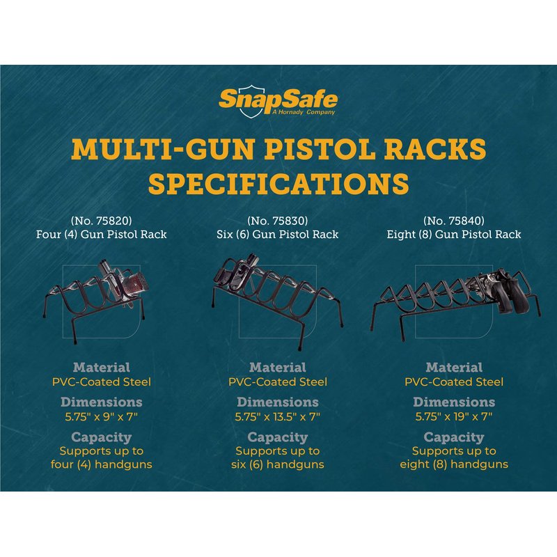 - Heavy Duty – This sturdy handgun rack has a PVC coating which prevents scratching or damage to your handguns. Featuring 4 rubberized feet, it won't slip or slide in your gun safe or on a workbench