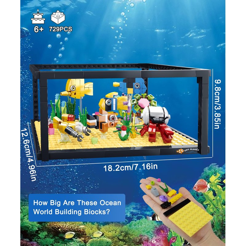 - 【Quality Assurance】The fish tank building toys made of original ABS material, durable and non-toxic plastic kits,passed ASTM F963-17 and CPSIA tests.It is 100% safe and smooth,without peculiar smell and not rough.These consists of 729 block bricks and 1 clear manual.Fully assembled, it measures 7.1”x4.9”x3.8” which allows it to makes for the nice display or decoration.