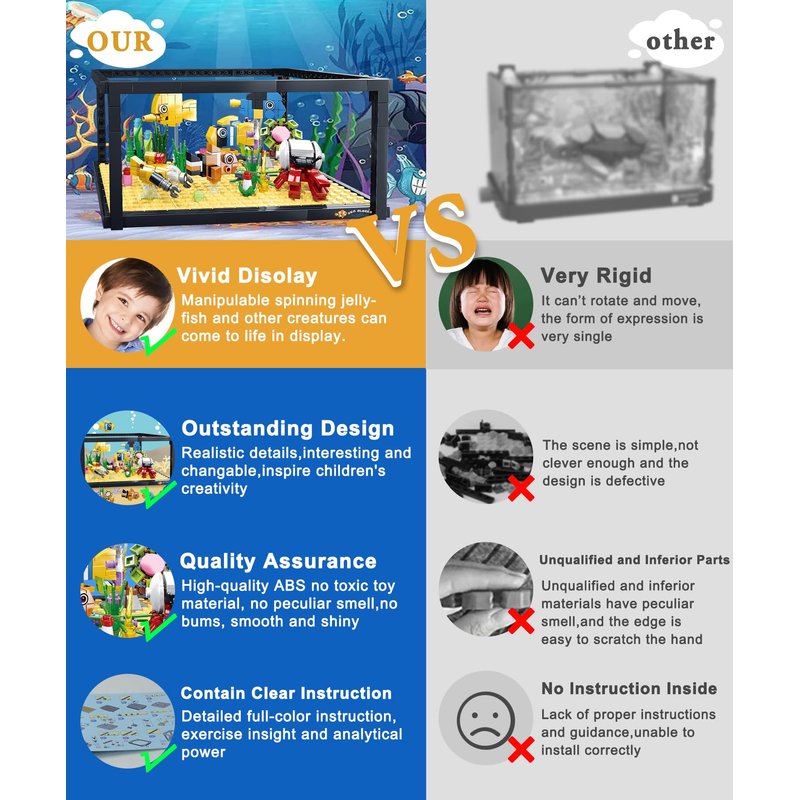 - 【Excellent Customer Service】We aim to provide with high quality fish building blocks and best after-sale service to our customers.If you received damaged,missing pieces or have any issue with our fish tank sets, please feel free to contact us.We will response as soon as possible.Hope you have a good shopping experience in our store.