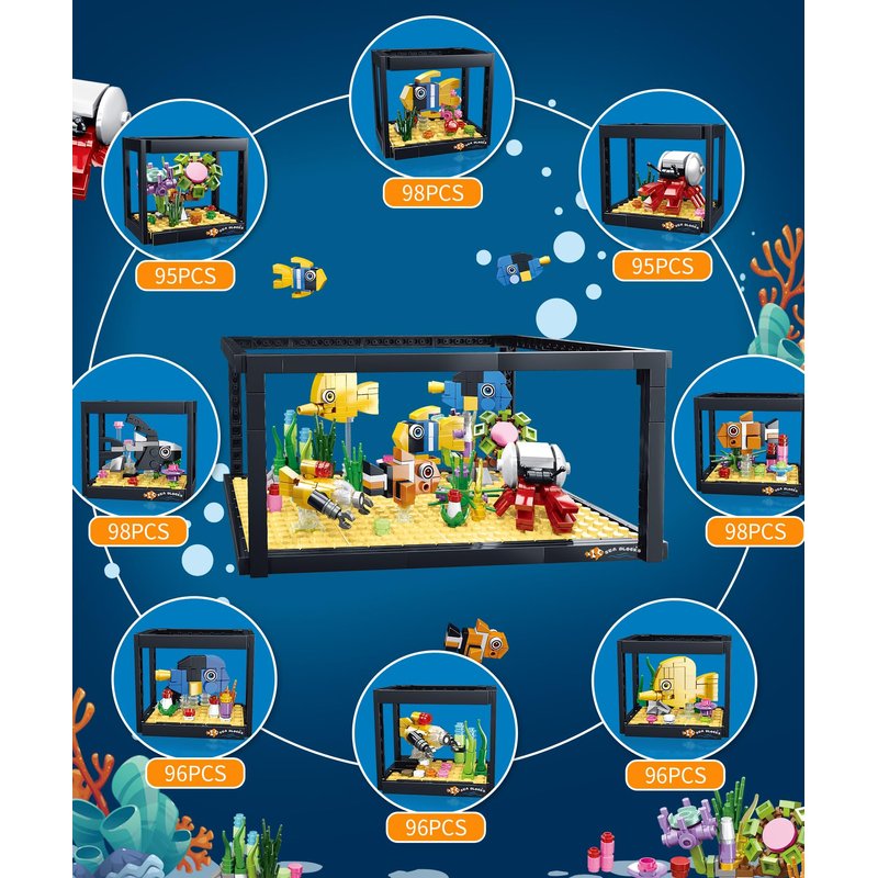 - 【8 in 1 Fish Tank Blocks】There will be 2 different building forms about the aquarium blocks.Kids can use each small bag to build 8 kinds of small fish tank building blocks or undo these to rebuild the big fish tank building block. Please notice that they can't build same time!