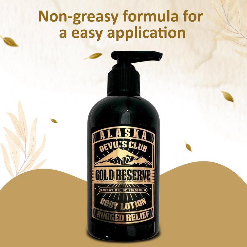 Our Alaska Devil's Club Gold Reserve pure body lotion is your daily ally, supporting your skin's health with every application. Now feel the difference with a non greasy body lotion made by the ones who understand the importance of combining nature with nurture.