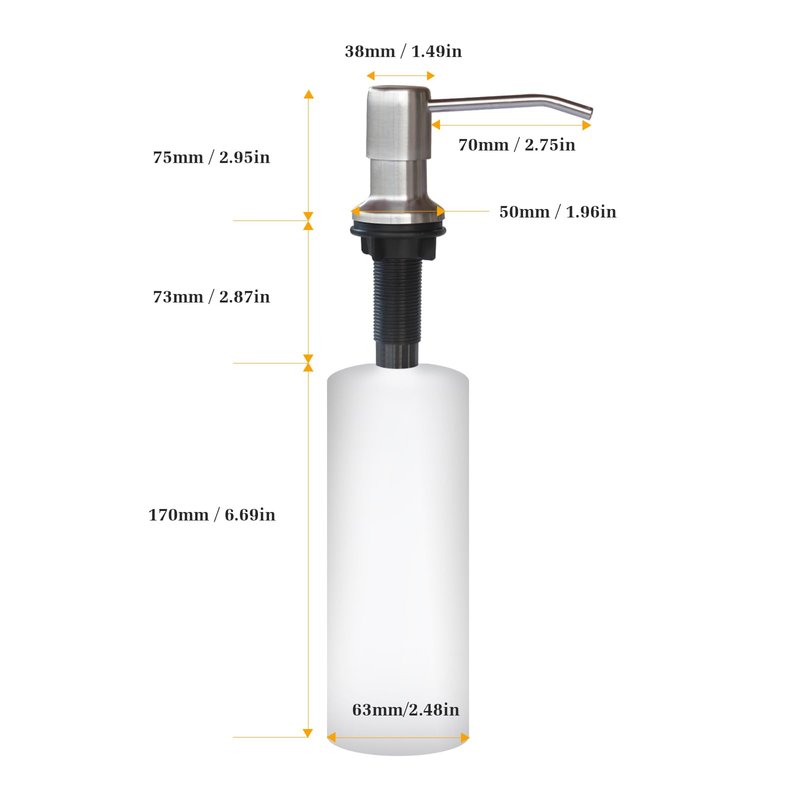 Quick and simple to install: Designed for as an Insink Soap Dispenser installation ( Granite, Stainless Steel, Wood ).