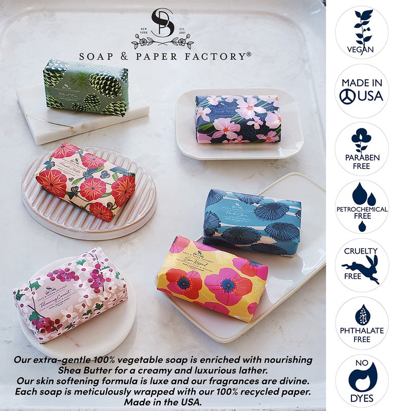 - ABOUT US: Soap & Paper Factory has been creating beautifully fragranced home and body products for over 20 years. Our products are free from parabens, phthalates, petrochemicals and dyes. We never test on animals and our products are 100% vegan. Female owned and operated. Born in New York. Made in the USA by happy people!