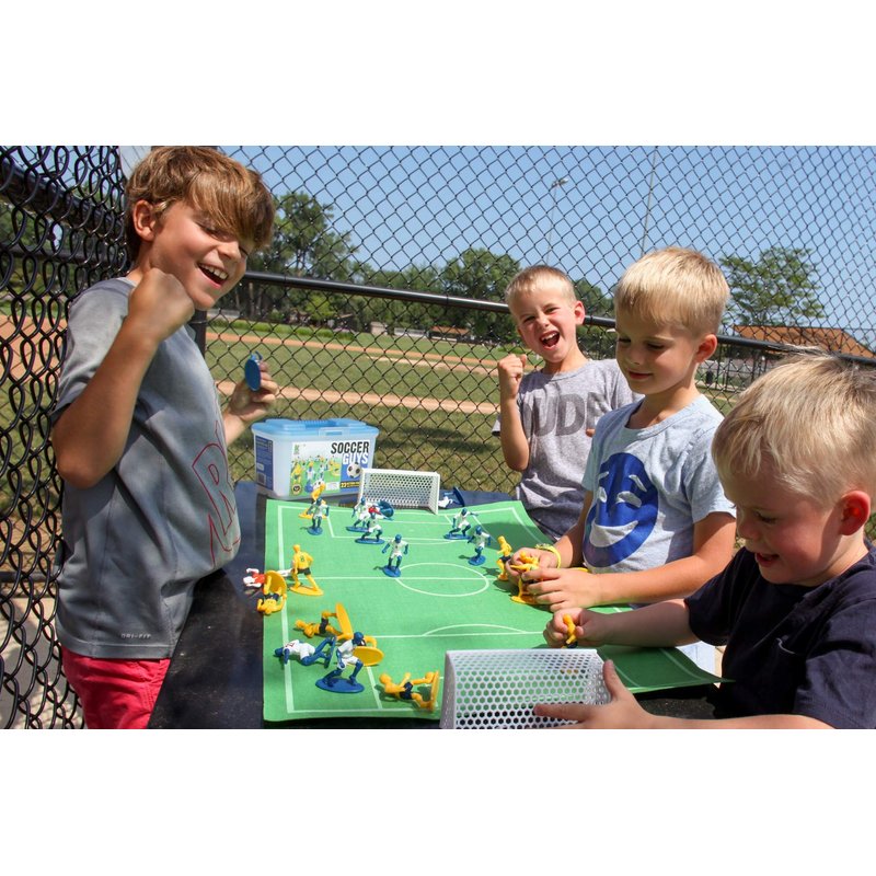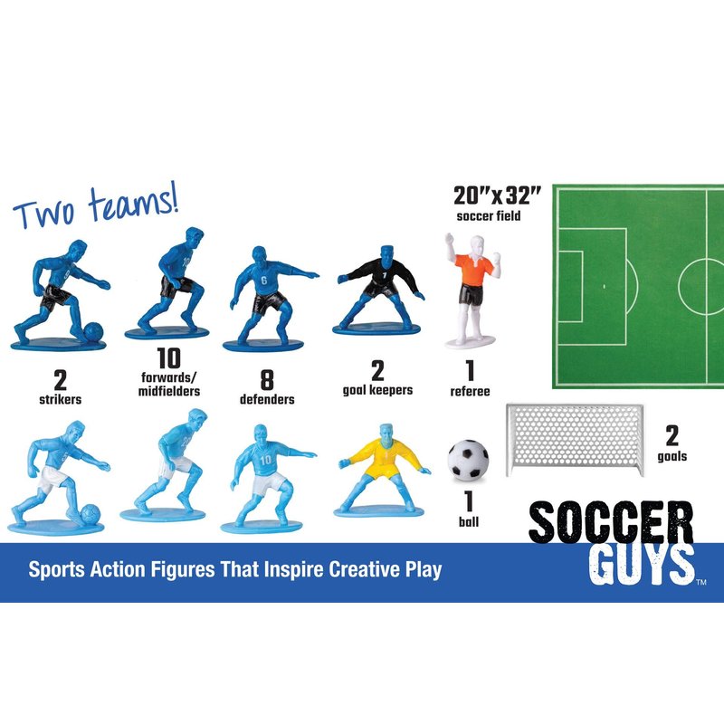 - INCLUDES: 27 pieces - 22 Soccer GUYS, an oversized soccer ball, a ref, felt field, 2 goals, a simple instruction booklet that describes the basic rules and strategy of soccer and a sturdy carry case makes it super easy for kids to travel with so Soccer fans always have a place to store their GUYS. A great way to help kids keep their toys organized. Two styles available. Award winning toy, invented by a Mom of 4 sports loving kids.