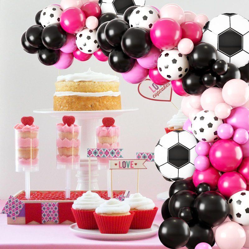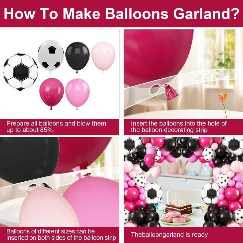 - 【Balloon Garland Kit】Pink soccer balloon arch kit includes: 30 pink balloons, 33 black balloons, 20 light pink balloons, 13 rose red balloons, 2 soccer foil balloons, 5 soccer printed balloons, glue dispensing, 5m Balloon chain and 10m ribbon. Give full play to your imagination to create amazing effects with balloons of different colors and sizes!