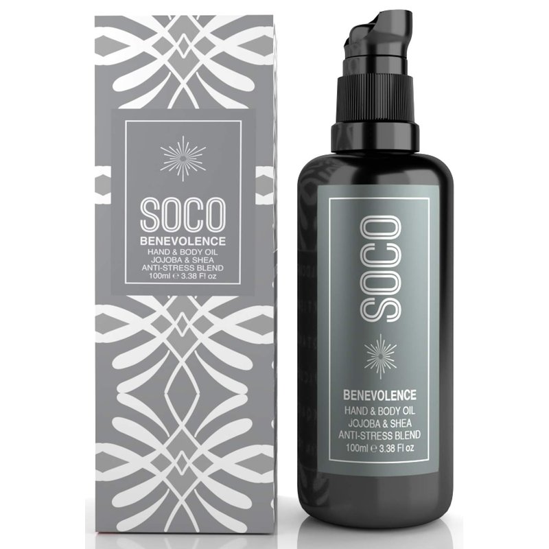 Luxurious & fragrant hand & body oil, SOCO BENEVOLENCE contains highly prized nutrient rich oils from around the world, known for skin healing and free radical defense. Featuring Jojoba, Rosehip Seed and Shea Oil, with hints of Vanilla and Lavender. Directions: Apply oil generously to revive dry hands and body. ingredients: sweet almond oil, avocado oil, shea butter, red raspberry oil, organic jojoba oil, organic castor oil, mixed tocopherols, organic essential oils of camphor, lavender & vanilla 100ml, 3.3 oz
