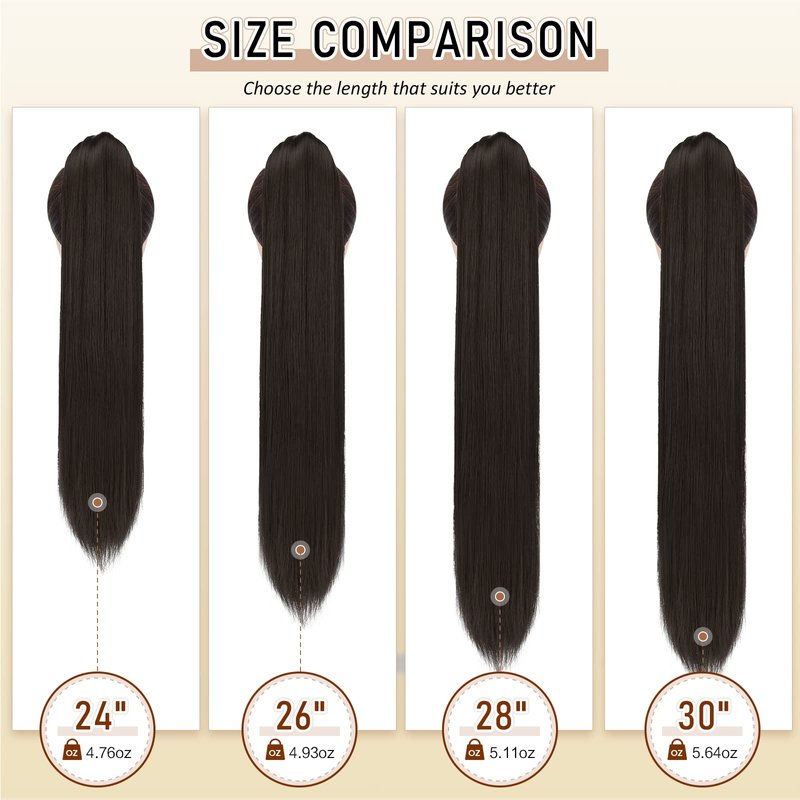 - Long straight ponytail extension. Weight: 5.64 oz. Length: 30 inch. Color: Jet Black. Natural straight texture. Hair extensions ponytail is made of premium synthetic fibers which looks human hair and feel softer and smoother. And can be ironed between 270℉ and 301℉.