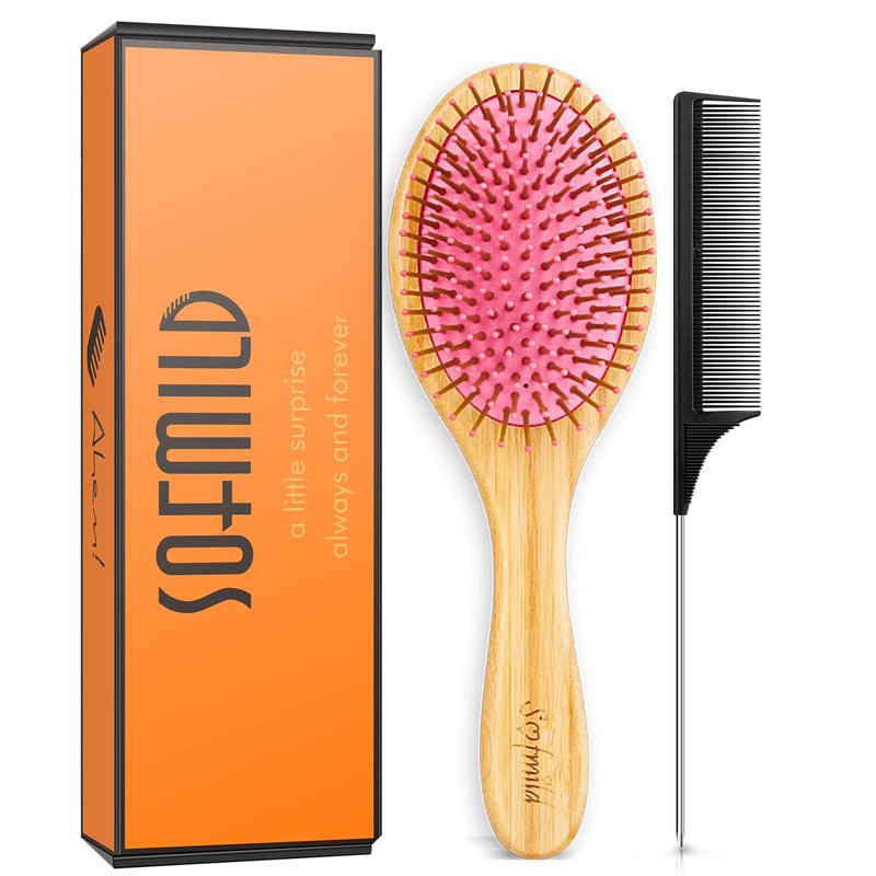 Sofmild Bamboo Wooden Paddle Hair Brush Comb Set, Hairbrushes for Women Men Kid Detangling Hair Massaging Scalp with Round Tip Bristles for All Hairstyles (Pink Wooden)