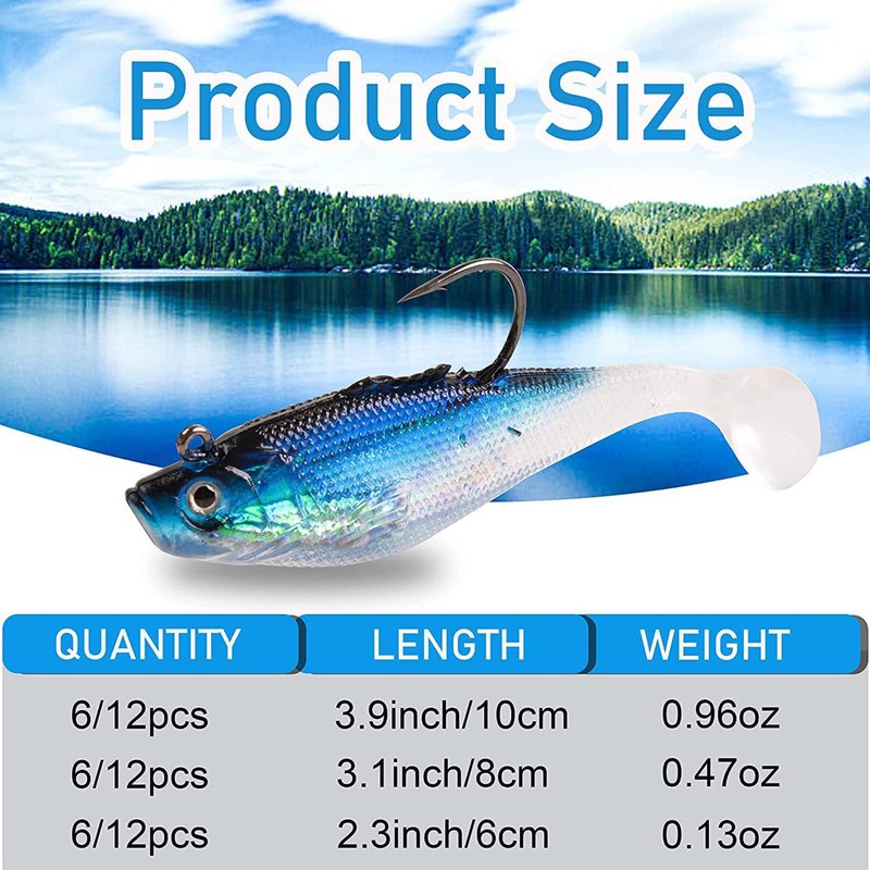- 【Package Include】Size 2.3 inch, 3.1 inch, 3.9 inch swim bait available for your choose, 6pcs/12pcs each size in a lot