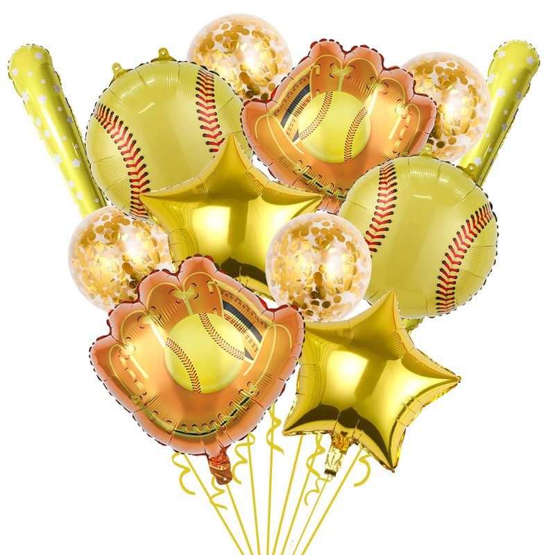 - Softball Balloons Set Included:2 pcs 20 inch softball glove jumbo balloons,2 pcs 18 Inch round foil mylar softball balloons,2 pcs 30 inch softball bat balloons,2 pcs 18inch gold star balloons,4 pcs 12 inch confetti latex balloons,1 pcs ribbon,1 pcs straw. Use these softball balloons as table centerpieces, photo props, or as a backdrop for your party.