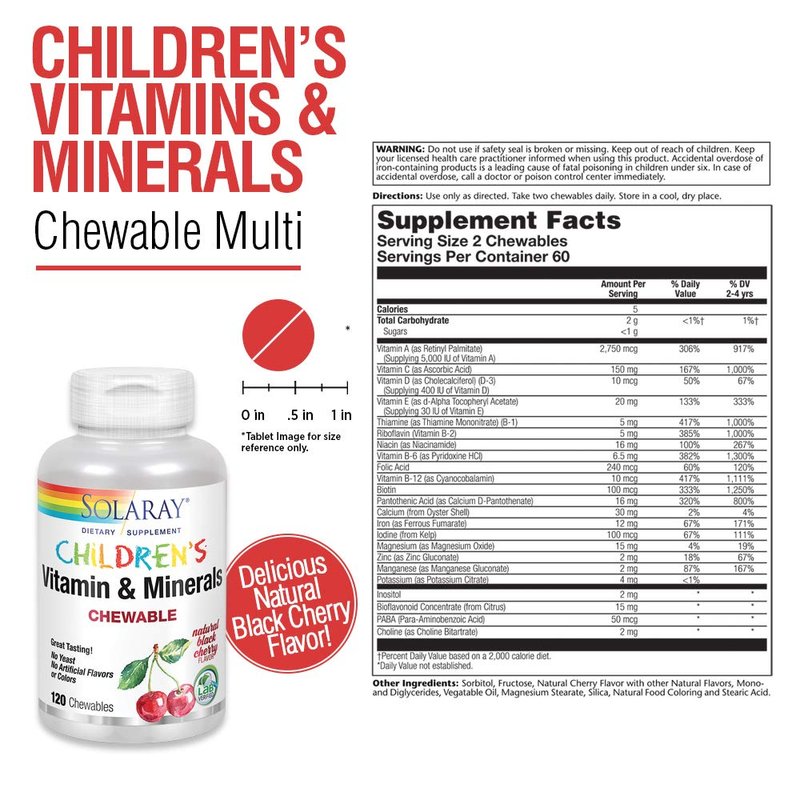 Solaray Childrens Vitamins & Minerals Complete Multivitamin for Kids Great Black Cherry Flavor (076280047974) (120 Chews, 60 Serv)