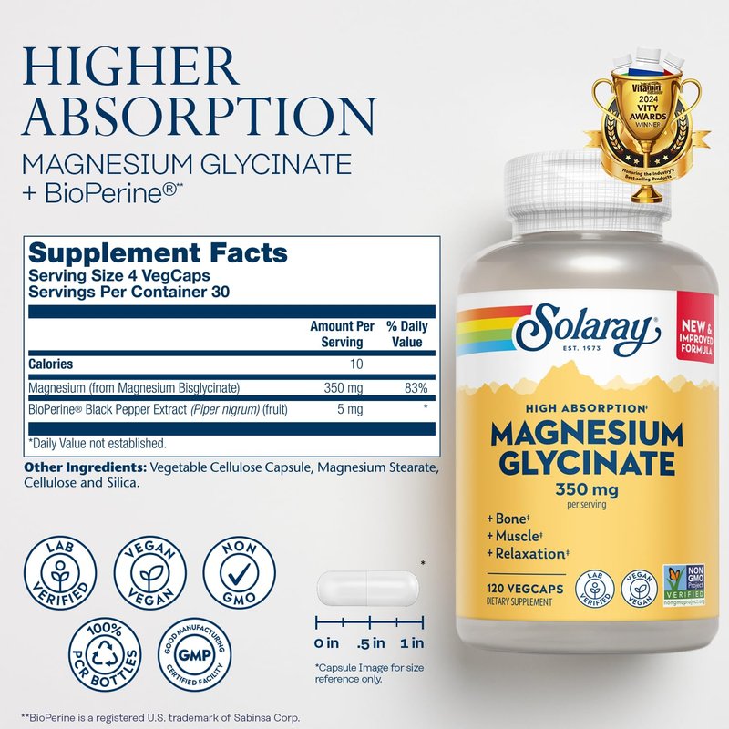 Magnesium is an essential mineral involved in more than 300 biochemical reactions in the body. But not all magnesium is created equal. Formulated for higher absorption, gentle digestion and maximum benefit, Solaray Magnesium Glycinate is made by reacting magnesium with the free-form amino acid glycine and includes 5 mg of BioPerine to make the magnesium more available to the body.* Intended to help with healthy relaxation, our magnesium supplement also helps support strong bones and teeth, muscular and nerve function and a healthy heart.* Each serving is conveniently divided into four vegan magnesium glycinate capsules, so you can take it throughout the day for better utilization. Like all Solaray products, Magnesium Glycinate 350mg is lab verified for potency, purity, and identity. Confidence in the Solaray name is just one of the reasons we’ve been around so long and maintain our place as a leader in the industry. Unlike many other companies, we manufacture almost all our own products, which gives us the ability to thoroughly test and screen raw ingredients for the slightest amount of impurities and manage the production process to provide the best possible quality. Rest assured, only the purest formulas ever reach your cabinet. Also look for: magnesium pills, glicinato de magnesio para mujeres, magnesio glicinato 400mg pure, pastillas de magnesio, magnesio quelado.