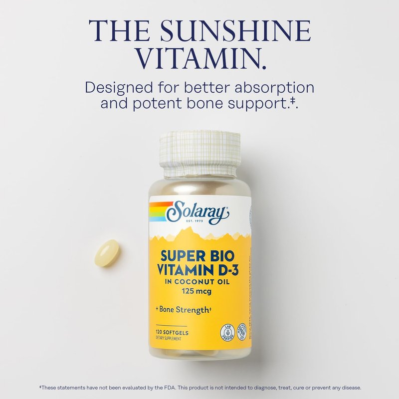 SOLARAY Super Bio Vitamin D3 in Coconut Oil - D3 Vitamin 5000 IU - Bone Health and Immune Support Supplement - Lab Verified, Made Wtihout Soy, 60-Day Guarantee - 120 Softgels, 120 Servings
