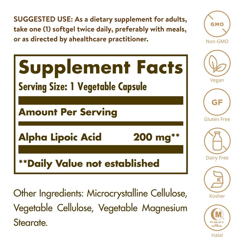 - Gluten, Wheat & Dairy Free; Solgar Alpha Lipoic Acid is non-GMO, vegan, kosher, and free of: gluten, wheat, dairy, soy, yeast, sugar, sodium, artificial flavor, sweetener, preservatives, and color; Suitable for vegetarians