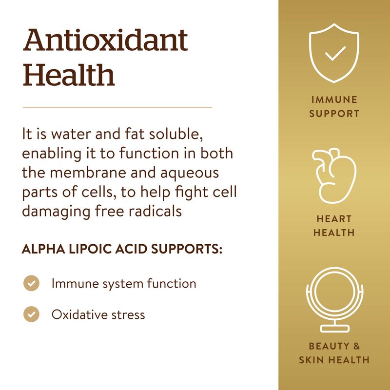 - General Health; Alpha Lipoic Acid supports healthy nerve function and helps to metabolize sugar in the body