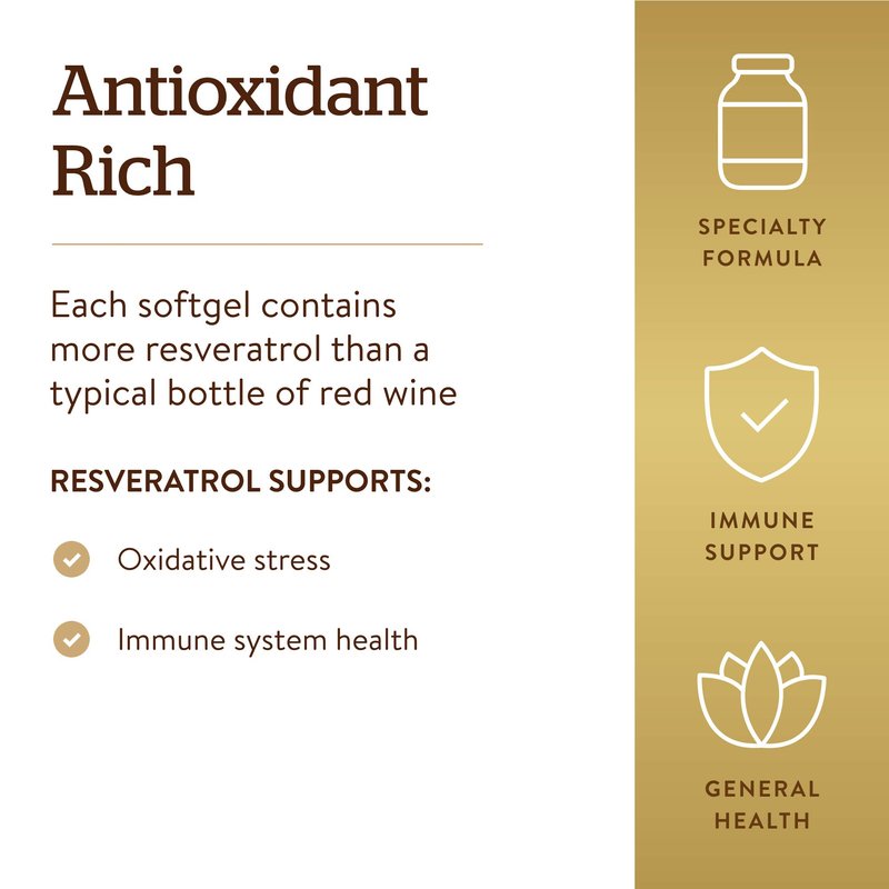 Solgar Resveratrol with Red Wine Extract, 250 mg, 60 Softgels - Antioxidant Protection - Immune Support - Red Wine Polyphenol - Non-GMO, Gluten Free, Dairy Free - 60 Servings