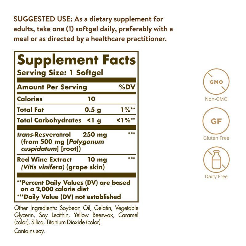 - Gluten, Wheat & Dairy Free; Solgar Resveratrol with Red Wine Extract is non-GMO and free of: gluten, wheat, dairy, yeast, sugar, sodium, artificial flavor, sweetener, and preservatives