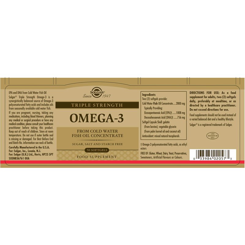 - Optimum Purity; Sourced from deep-sea, cold water fish, Solgar Triple Strength Omega 3 950 mg is purified via molecular distillation to remove mercury and other environmental impurities