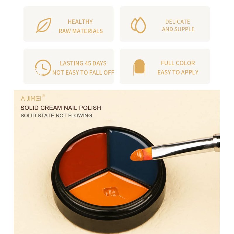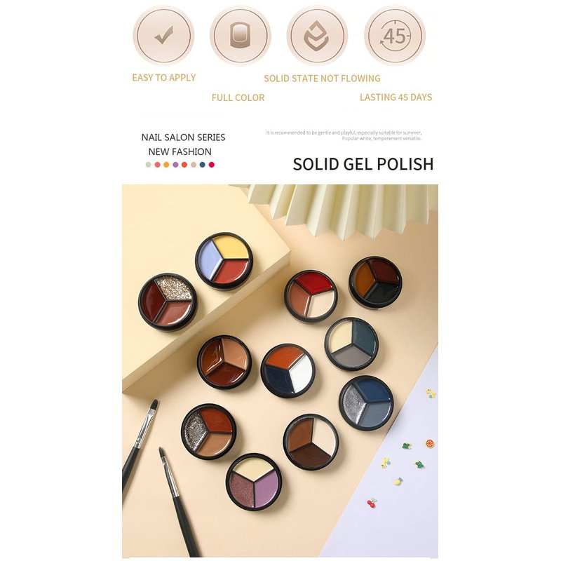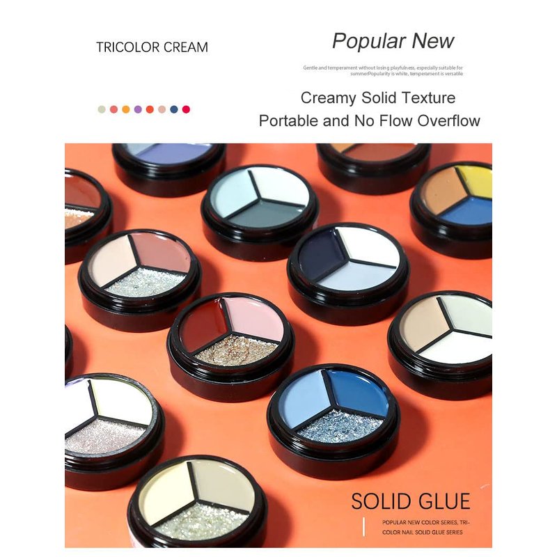 solid gel polish Solid gel cream gel nail polish made of natural ingredients, three-in-one palette design solid cream gel polish, suitable for different seasons and life, easy to carry.The cream gel polish is not easy to flow, and it can easily create exquisite nail art such as solid color paintings, gel paintings, painted flowers, cartoon patterns, square patterns, etc. It is very suitable for beginners.Do not touch your eyes and keep away from children! Skin Test before using is necessary. Stop using immediately once feeling uncomfortable! Required nail dryer lamp and base top coat. One-stroke for perfect coloring,solid gel nail polish creamy texture gel polish make nail art obtain the High Pigment. Wet the UV gel brush with a little base coat before applying will make it easier to apply and come out with better effect. Adjustable color intensity by mixing base coat or clear glue.0.5oz/15ML Solid Cream Gel Polish x 1Pack Professional Solid Glue Brush x1PCS