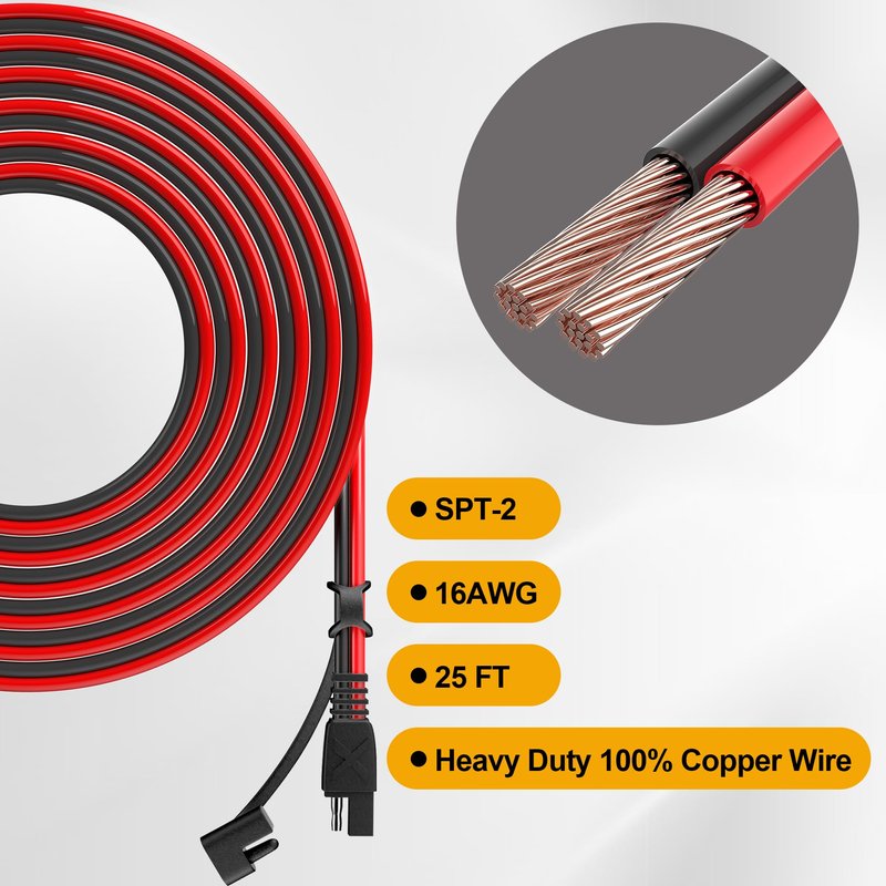 - [ Premium Material ] The SAE cable is made of 25FT copper wire, covered with high-quality insulation PVC jacket, with a specification of 16AWG, 2-pin, red wire for positive and black wire for negative. The wire harness is lightweight, flexible, durable, and suitable for solar panel chargers.