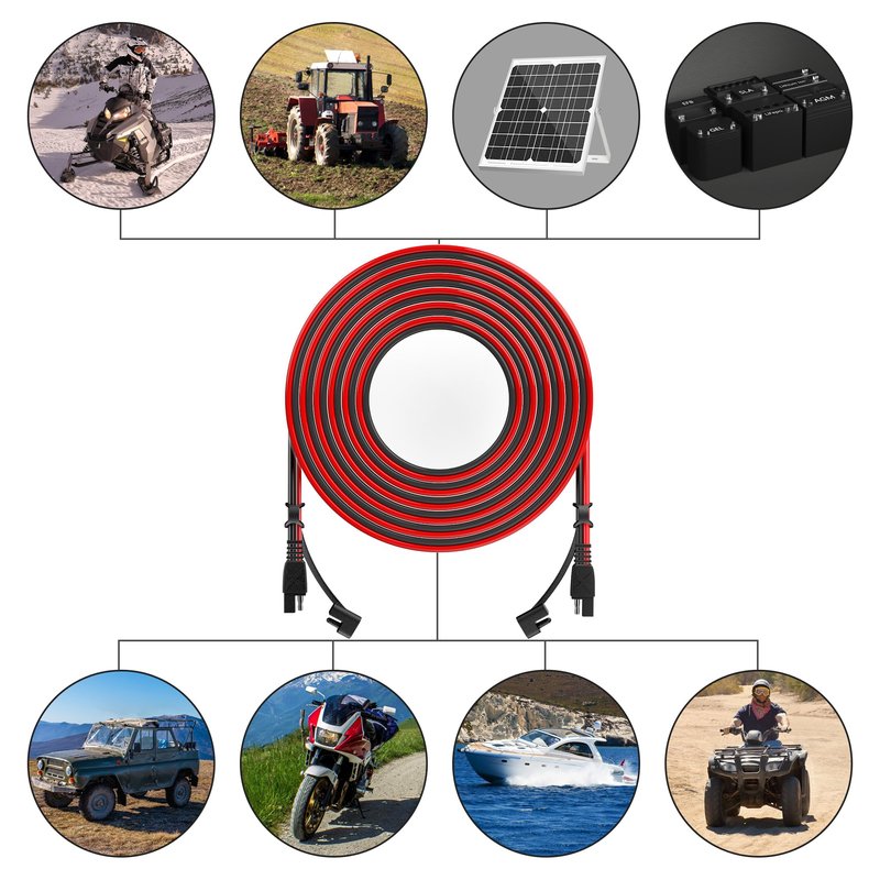 The sae extension cable is suitable for various applications, such as solar panel chargers, cars, motorcycles, tractors, trucks, ATVs, RVs, and more. You can use it to extend the reach of your power source, transfer electricity, or charge your devices. The cable length is 25 feet, which is long enough for most situations.
