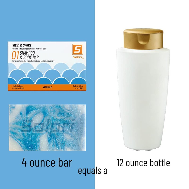 Solpri's Swim Shampoo & Body Bar is designed as a water saving alternative to traditional swim shampoos. Like all of Solpri's swim series it uses Vitamin C to get rid of chlorine on your hair and skin. This bar was designed specifically for hair unlike a traditional bar soap which would be too harsh for hair.
