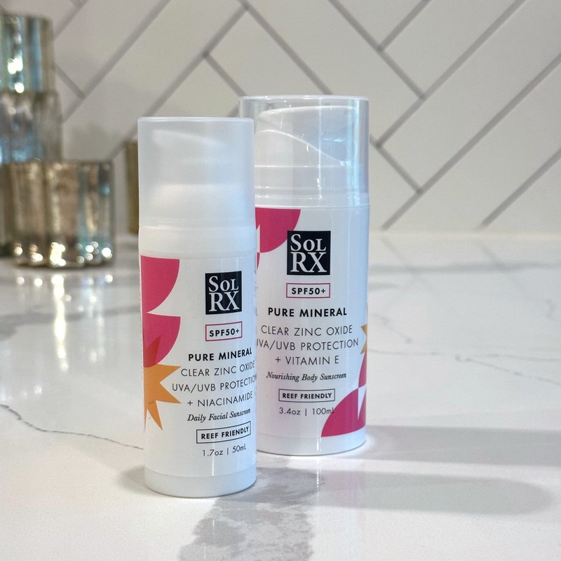SolRX PURE MINERAL Daily SPF 50 Sunscreen is clinically formulated for everyday use -with no harmful chemicals! This Daily Facial Sunscreen is designed with added nutrients, like Niacinamide, perfect for your daily skincare routine. As a Clear Zinc-Oxide Sunscreen, it is broad spectrum to protect from both UVA (aging) and UVB (burning) rays. With a lightweight & silky feel, PURE MINERAL goes on smoothly and dries instantly to a clear matte finish for healthier-looking skin. Designed to be worn with makeup or alone, it works with all skin types, even those with sensitive skin. Using reef safe ingredients, you can now get everyday use protection without Oxybenzone or Octinoxate - making it Hawaii Act 104 Compliant for Reef Safety. Unlike drugstore sunscreens, SolRX products are crafted with the highest level of dermaceutical grade ingredients. Because when it comes to your skin, quality counts. As part of a daily skin regimen, SolRX PURE MINERAL replenishes and repairs sun damaged skin. Plus, daily sunscreen use is recommended by dermatologists, aestheticians, & the Skin Cancer Institute to help reduce the risk of skin damage. Our Pure Mineral SPF50 Sunscreen is fragrance-free, paraben-free, non-comedegenic, hypoallergenic, non-irritating, & long-lasting. It’s cruelty-free, vegan, and gluten-free. It is safe for children & toddlers -and coral reefs. This sunblock is non-sticky, non-oily, & quick-drying, with a silky smooth moisturizing texture. Pure Mineral SPF 50 Lotion is anti-aging, & non-nano. It prevents ultraviolet & infrared light damage, reducing skin-aging radicals. And it counteracts the drying effects of the tropic sun, pool chemicals, or ocean saltwater. Made with the same high-quality dermaceutical grade anti-oxidants, vitamins & anti-inflammatory elements found in the serums, emollients of a high-end skincare regimen or routine. For best application, dab small amounts around your skin, & smoothly wipe in for clear, non-ghosting, matte finish.