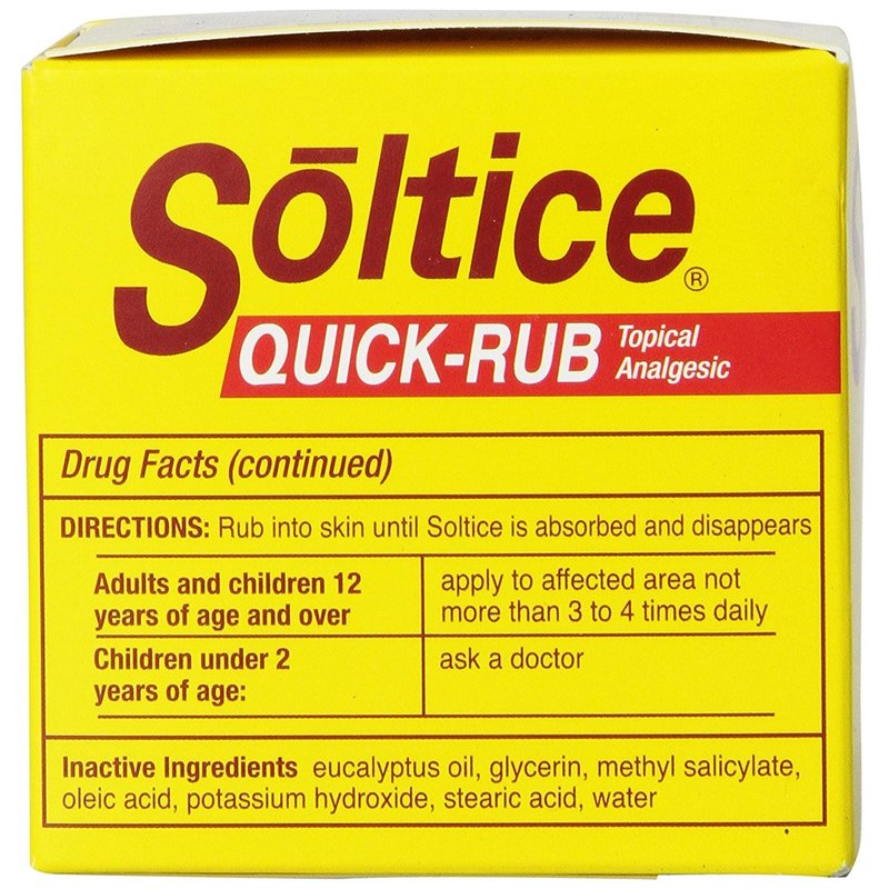 - TOPICAL ANALGESIC: Soltice Quick Rub helps temporarily relieve minor aches & pains of muscle & joints associated with simple headache, arthritis, strains, bruises, & sprains.