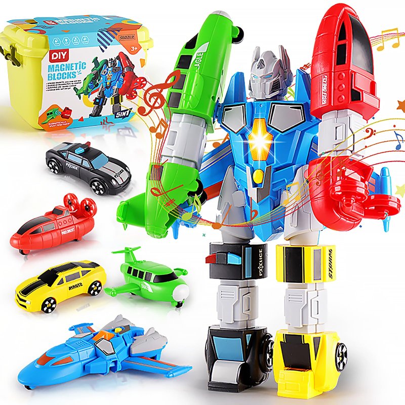 SOMMER 5-in-1 Magnetic Vehicles Toy Playset, Mix and Match STEM Stacking Assembling Car Kit with Storage Box, Transform into Robot, Birthday Gift for Toddler Kids 3 4 5 6 7 Year Old Boys Girls