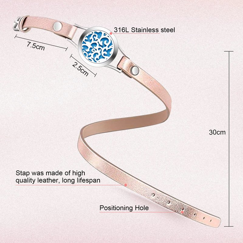 - UINQUE DESIGN-The aromatherapy bracelet is designed to loop around twice on your wrist,and the dial of the bracelet is designed with circular carvings to make it look retro and elegant.Just add a few drops of oil to the diffuser bracelet, and you will be surrounded by a charming scent in daily life.