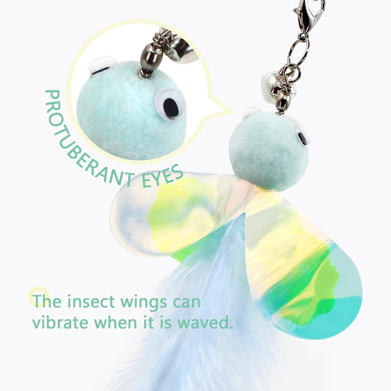 - [Multiple Feathers with Bells] The cat wand toys comes with 6 different replaceable feather toys, which will bring more play options and fun to cats. The toys are easy to replace with the upgraded hook. A suitable bell on the toys can attract the cat’s attention and at the same time avoid affecting the cat’s hearing when interacting with the cat.