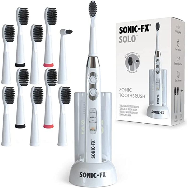 Sonic-FX Solo Electric Toothbrush w/ 10 Brush Heads + 1 Interdental, Charcoal Bristles, Rechargeable, Charging/Storage Base, 3 Brush Modes, Smart Timer, 2 Months Use on Full Charge, White Color