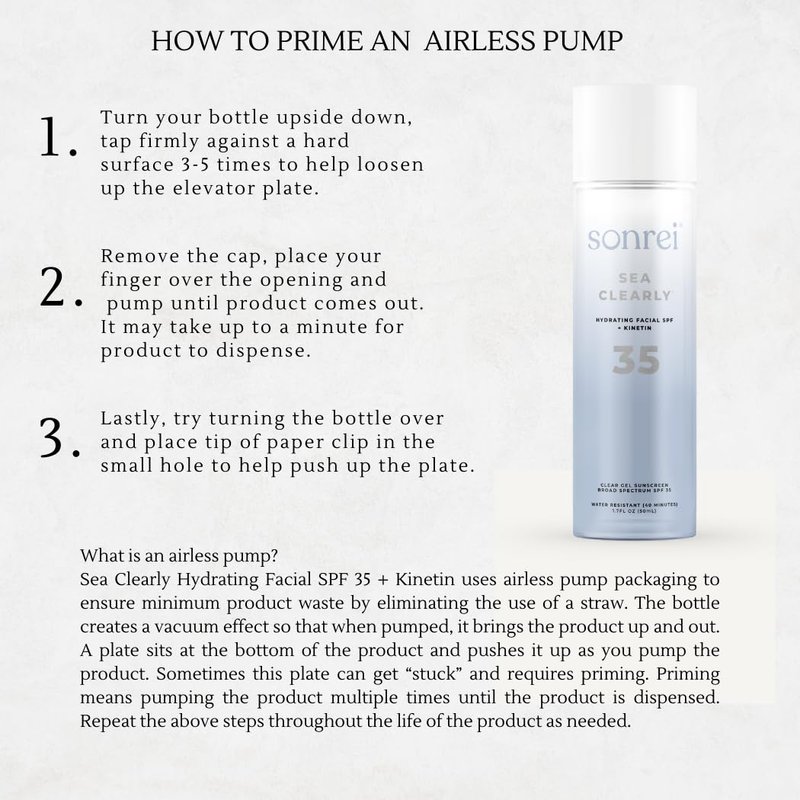 The Sonrei Sea Clearly Hydrating Facial SPF 35 Kinetin Clear Sunscreen Gel is a game-changer in the world of sun protection. This innovative sunscreen brings you the dual benefits of advanced UV protection and intensive skin hydration in a single, easy-to-use product. It’s more than just a sunscreen - it's a skin-enhancing serum designed to protect, nourish, and rejuvenate. Our facial sunscreen is formulated with Broad Spectrum UVA/UVB protection, crucial in shielding your skin from the sun's damaging rays that can lead to premature aging, skin discoloration, and even skin cancer. With an SPF of 35, you can be confident that you're providing your skin with an adequate level of protection, even on the sunniest of days. But the Sonrei Sea Clearly Facial Sunscreen goes above and beyond the role of a traditional sunscreen. Infused with Kinetin, a plant-based antioxidant known for its powerful anti-aging properties, it works to hydrate the skin and reduce the appearance of fine lines and wrinkles. Kinetin has been scientifically proven to enhance the skin's natural rejuvenation process, leading to a more youthful, radiant complexion. The clear gel formula is a standout feature, avoiding the common issue of white residue often found with traditional sunscreens. It's non-greasy, glides onto the skin with ease, and absorbs quickly. This makes it ideal for everyday use, as it won't clog pores or cause breakouts. It's perfect for use under makeup or on its own, providing an invisible shield of sun protection while enhancing the natural beauty of your skin. One of the key values at Sonrei is our commitment to ethical and sustainable production. We are proud to say that our products are vegan and cruelty-free. Despite its light texture, our sunscreen is also water resistant for up to 40 minutes, so you can enjoy water activities or sweaty workouts.