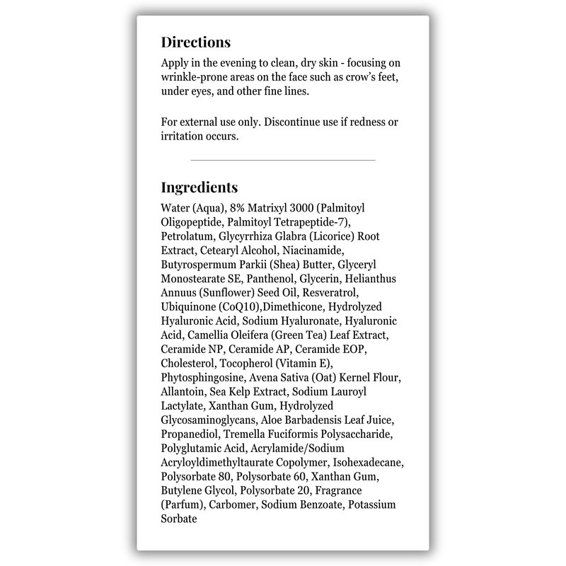 - [Serum 1 - Peptide Complex 8% Matrixyl 3000] - For Firmer, Softer and Supple skin without the irritation, Matrixyl 3000 is one of the most studied Anti-Aging Peptide Complex without the peeling and sensitivity from Retinoids. This Night Cream can also be layered under retinoids and retinol for an enhanced Anti Aging Effect. Matrixyl 3000 can also deeply hydrate your skin to reveal signs of softened fine lines.