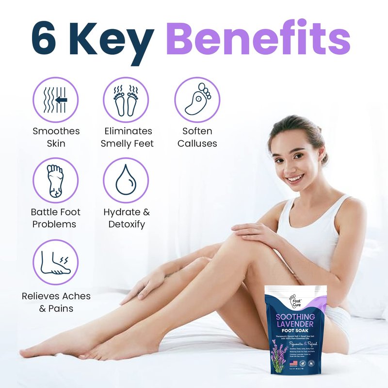 - GET SOFTER, BEAUTIFUL FEET & TOENAILS: Unlike other foot care products that may contain abrasive chemicals and potentially irritating ingredients, this Foot Cure Lavender Oil foot soak with Epsom Salts is made to be as gentle and skin-friendly as possible. It’s suitable for men and women of all ages, and safe even for the most sensitive skin types.