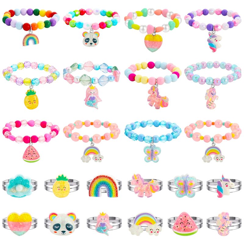 - What you get: 12 sets of matching jewelry with different shiny colors and styles, each set includes 1 rings and 1 bracelet, different styles can match your different outfit, makes little girls look more beautiful