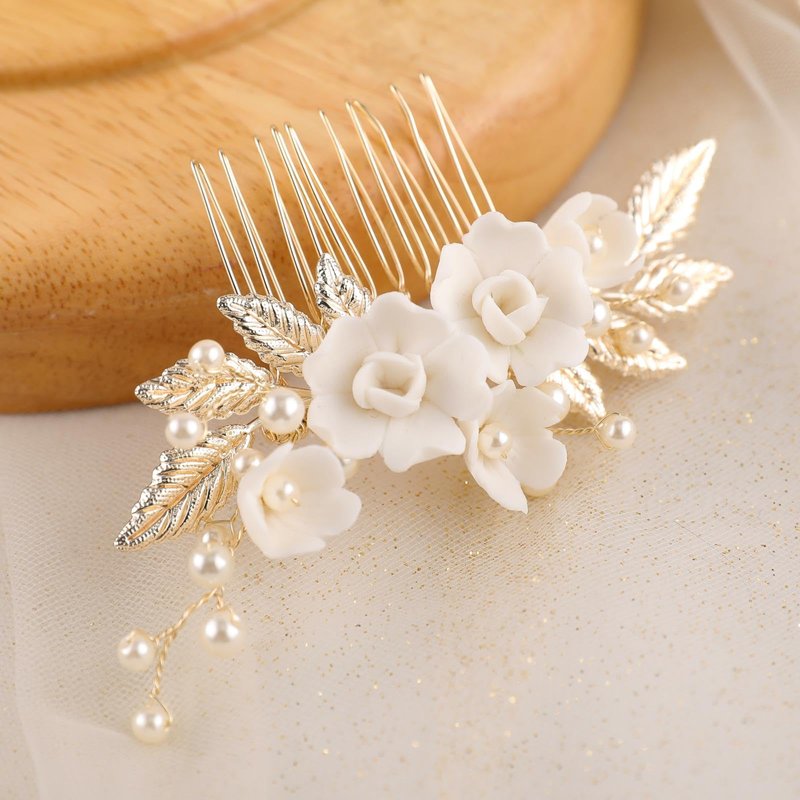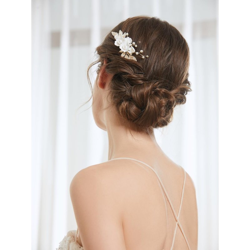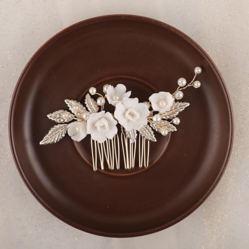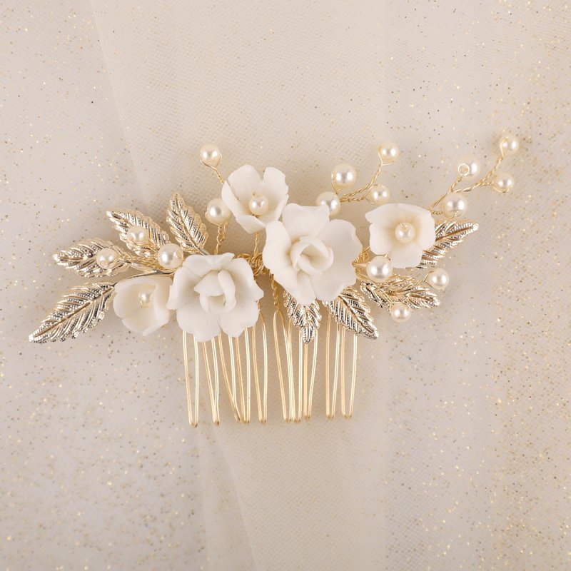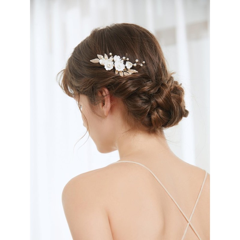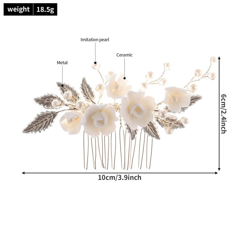 - ❀Artificial flowers are handmade of high quality ceramic which makes these flowers more pretty and realistic. The wedding hair comb is also decorated with alloy leaves and imitation pearls. High quality gold metal wedding hair accessories are very sturdy which can be wore for a long time. Smooth metal bridal hair accessories won't hurt your hair.