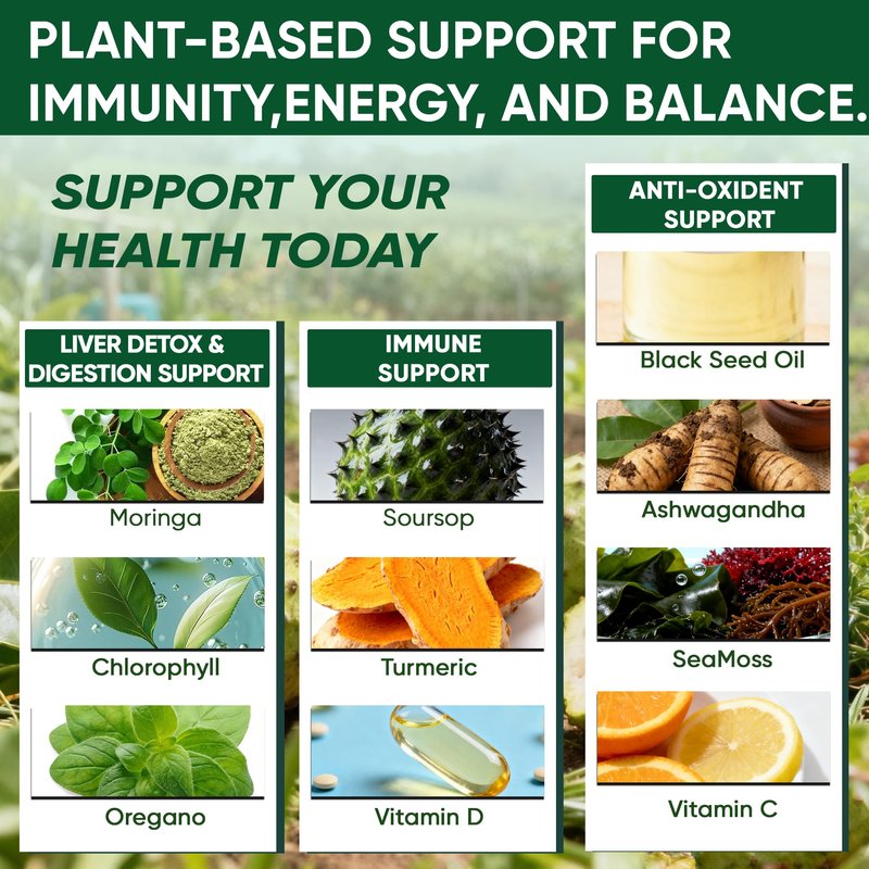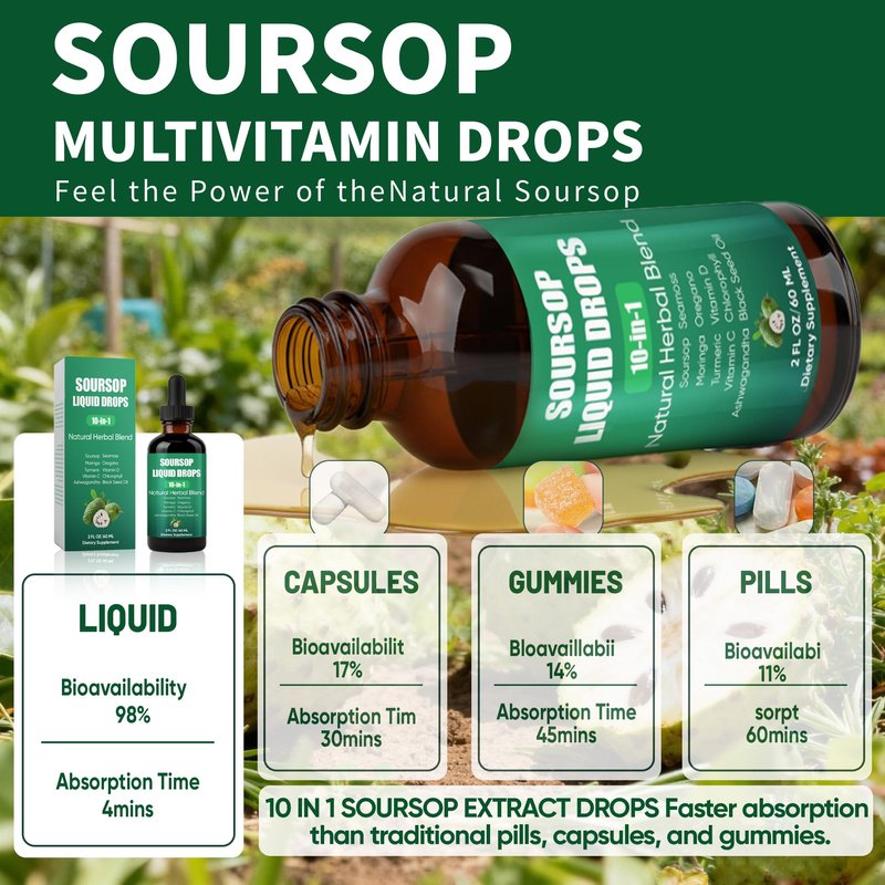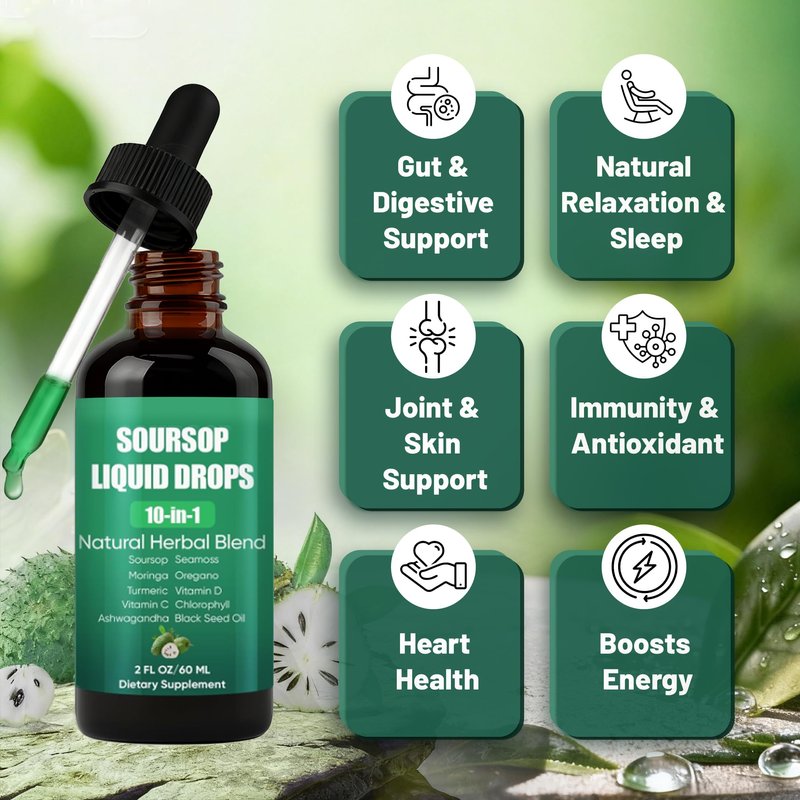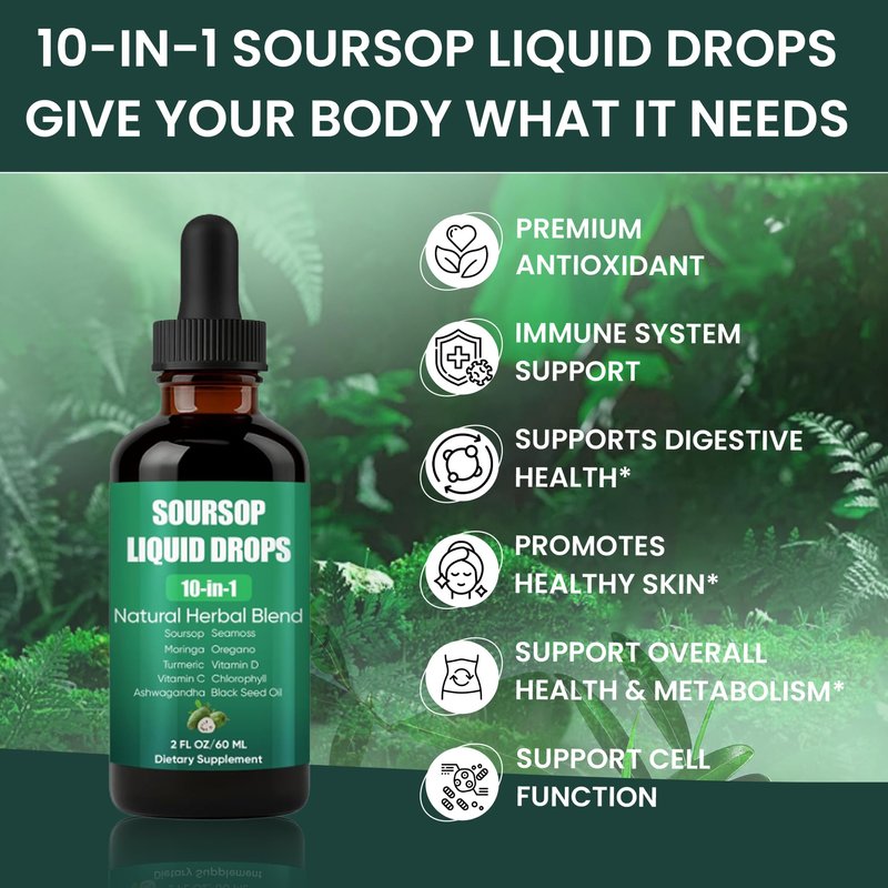 - 【10-in-1 Soursop Extract Drops】This liquid drops soursop with Soursop, Sea Moss, Moringa, Oregano, Turmeric, Black Seed Oil, Ashwagandha, Chlorophyll, Vitamins C, D. Suitable for a variety of dietary preferences and lifestyles.