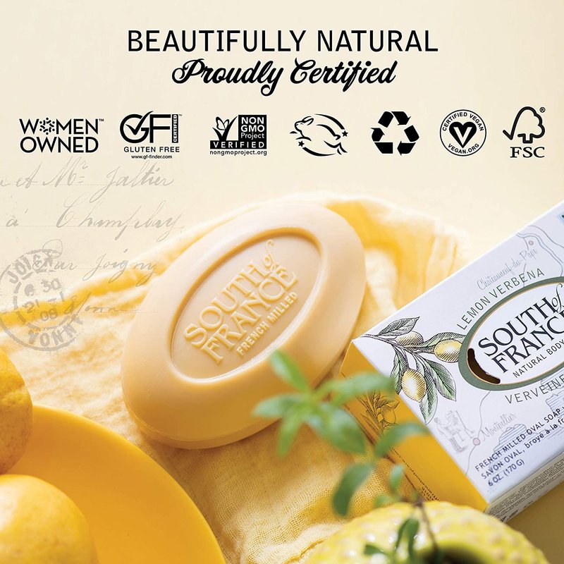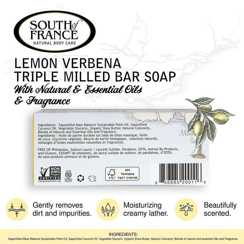 SOUTH OF FRANCE LEMON VERBENA OVAL SOAP COMBINES NATURAL GLYCERIN WITH ORGANIC SHEA BUTTER TO LEAVE YOUR SKIN SOFT AND DEEPLY MOISTURIZED. OUR ALL-VEGETABLE SOAP IS TRIPLE-MILLED IN THE MARSEILLE TRADITION FOR A PAMPERING, CLEANSING EXPERIENCE. COCONUT OIL AND SUSTAINABLE PALM OIL CREATE A CREAMY, LUXURIOUS LATHER WITH THE FRESH SCENT OF LEMON TREES AND VERBENA PLANTS. OUR OVAL SOAP IS FREE OF PARABENS, PHTHALATES, AND SULFATES, AND IS A CRUELTY-FREE PRODUCT CONTAINING NO ANIMAL BY-PRODUCTS. INCLUDES ONE 6 OZ. BAR OF GLUTEN-FREE SOUTH OF FRANCE LEMON VERBENA OVAL : BLENDS OF NATURAL AND ESSENTIAL OILS AND FRAGRANCE;NATURAL COLORANTS;ORGANIC SHEA BUTTER;SAPONIFIED COCONUT OIL;SAPONIFIED MASS BALANCE SUSTAINABLE PALM OIL;VEGETABLE GLYCERINGluten FreeGMO FreeGMO FreeLength: inch X Width: inch X Length: inch X Sold in case of: 1 items