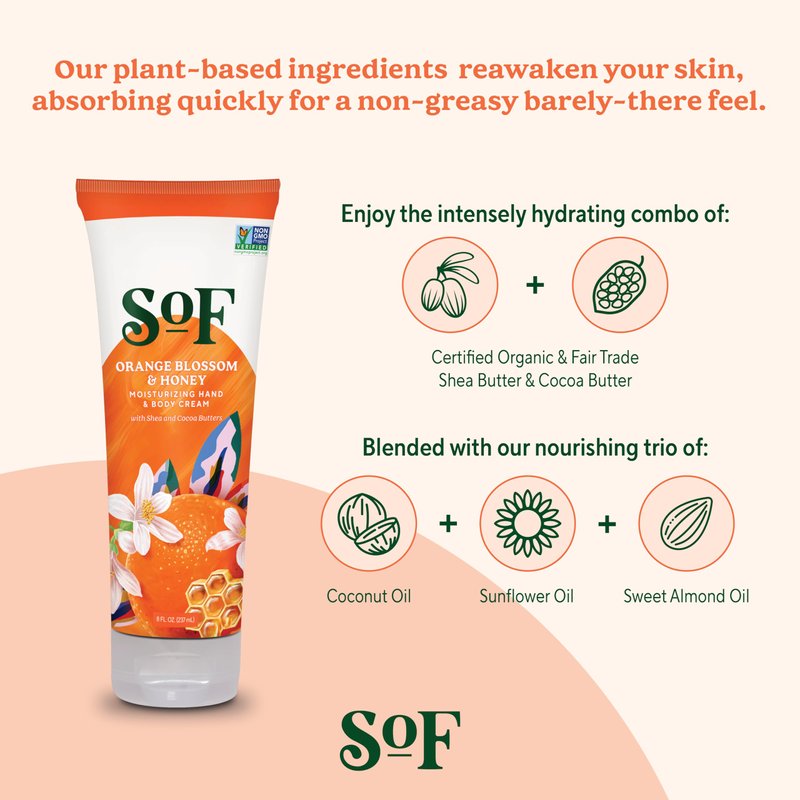 South Of France SoF (Formerly Moisturizing Hand & Body Cream - With Organic Shea + Cocoa Butter and Sweet Almond Oil,Non GMO & Vegan, Orange Blossom and Honey, 8 Fl Oz, 1 Pack