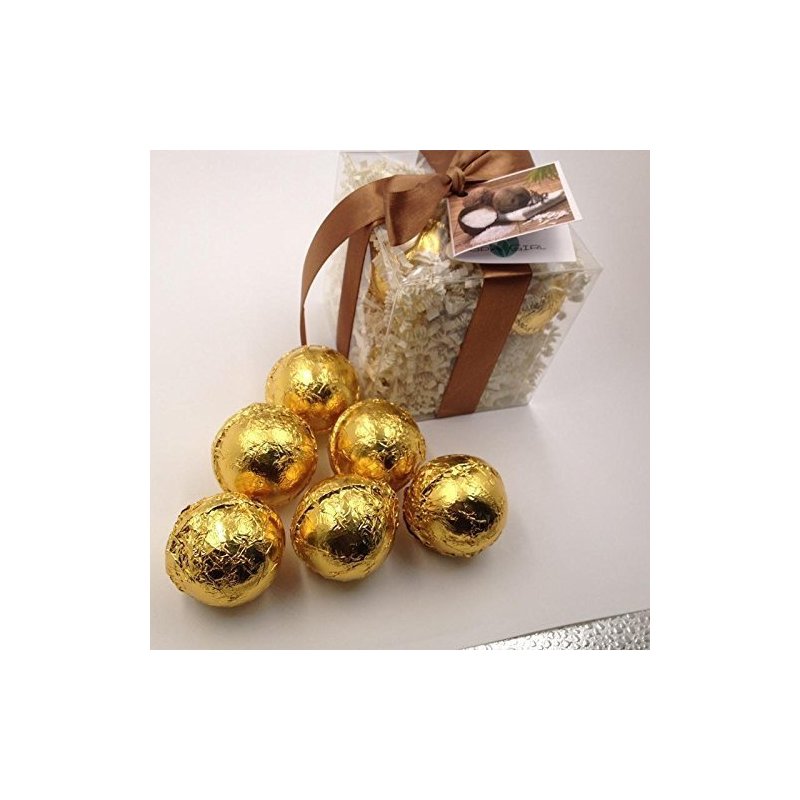 Our Coconut Vanilla Gift Set with 6 bath bombs (2.25 Oz each) individually hand wrapped in colorful foils to preserve freshness. Our 2.25 oz bath bombs are about the size of a golf ball, 2 inches in diameter, about the size of a ping pong ball. In this gift set you will receive 6 bath bombs in a clear gift box with a hang tag and coordinating ribbon. Spa Pure bath bombs are made with skin moisturizing ingredients including Shea Butter & Cocoa Butter, along with Organic Olive Oil, that moisturizes and replenishes your skin. Bathing with bath bombs is far better than lotion. The body's oils will lock in the skin all-natural moisture are 100% pure and natural ingredients, and many oils are Kosher too.