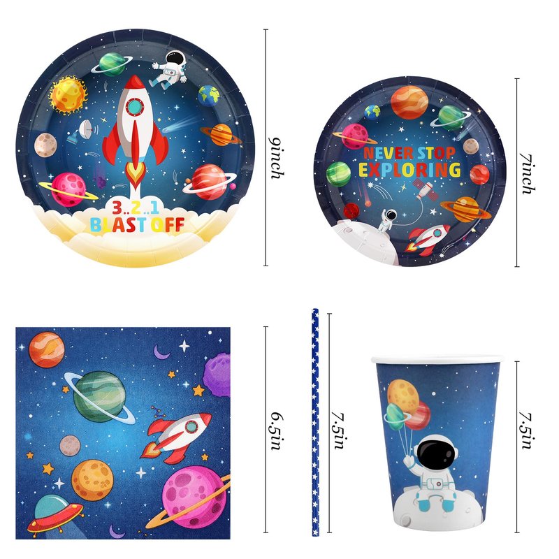 - 【Serves 24 Guests】: The space theme disposable dinnerware comes with 9" dinner paper plates *24, 7" paper dessert plates *24, 9oz paper cups *24, 6.5" napkins (3 layers) *24 and paper straws *24. The durable dinnerware set allows you to serve 24 guests at one time.
