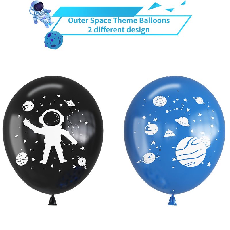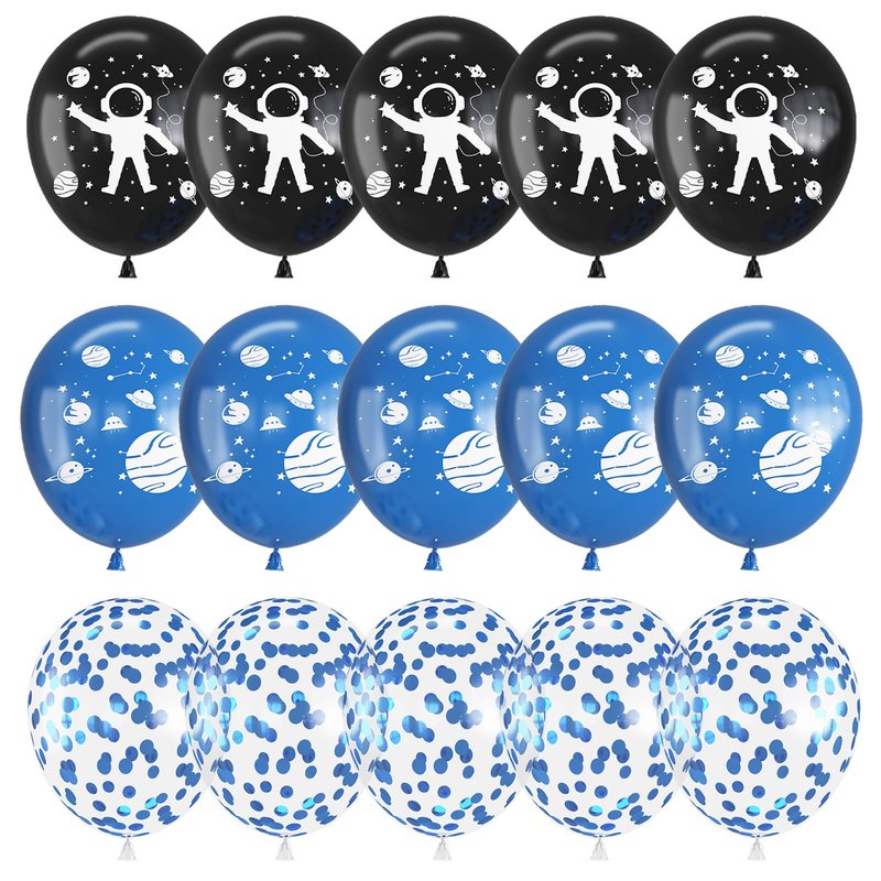 • πŸš€β€ Outer Space Party Decorations Supplies πŸš€β€: This set of space theme birthday party balloons set includes 15pcs 12" latex balloons, blue galaxy balloons 5 pieces, black astronaut balloons 5 pieces, blue confetti 5 pieces.