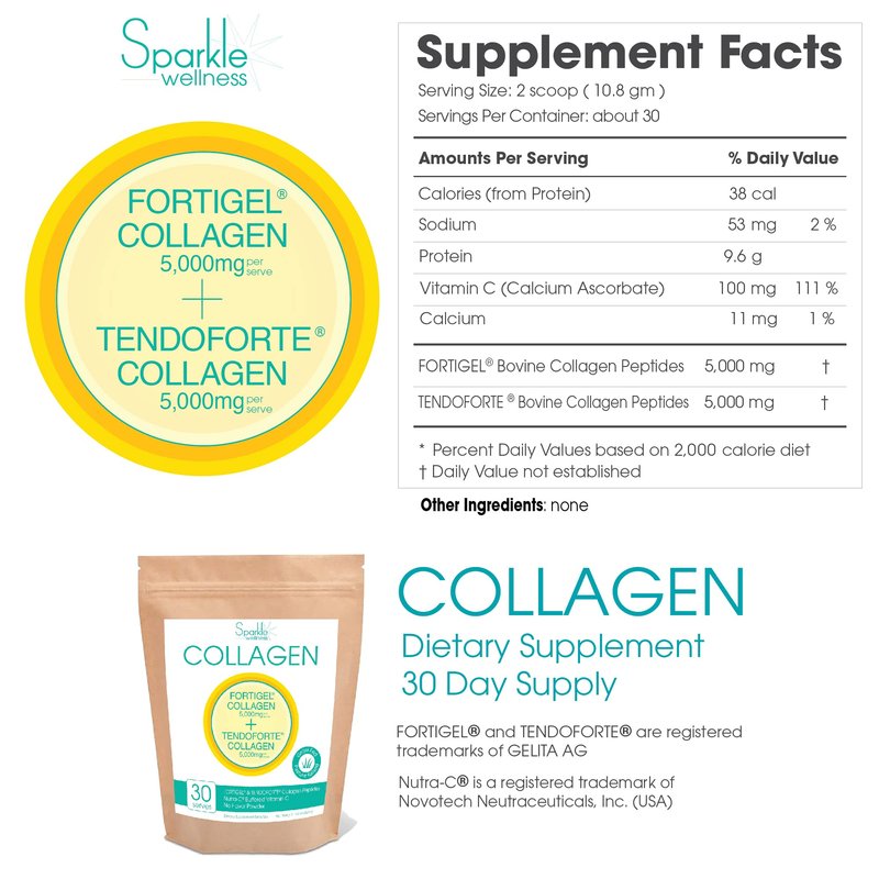This product contains the collagen peptides FORTIGEL and TENDOFORTE, plus Nutra-C Vitamin C.
