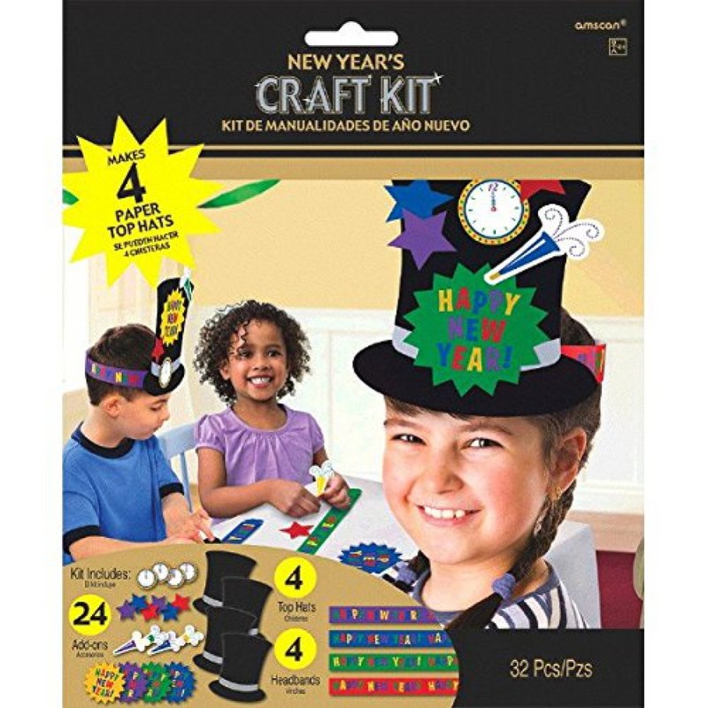 Who says New Year's Eve is just for adults? Kids can get in on the fun with this Top Hat craft kit. It comes with all the fixin's to make four top hat headbands. All the items are made of sturdy card stock. The headbands are purple, red, green and blue and read "Happy New Year" in multi-color letters. The top hat cutout is black there are a variety of other cutouts with which to decorate it: clocks, horns , stars and "Happy New Year" bursts. All of the items are attached easily attached with self-stick adhesive, so there's little mess. One size fits most kids' heads, This activity is recommended for ages 3 and older. It's also great for kids who are in camps or other kinds of day care during the holiday break.