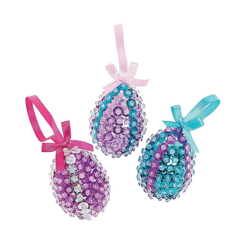 Sparkling Egg Ornament Craft Kit. Create unique sequin ornaments with this craft kit! Apply the sparkling sequins to each 2 3/4 egg and add a ribbon to make it complete. Use these ornaments to decorate your home for the holiday or give them as handmade gifts. All craft kit pieces are pre-packaged for individual use. Kits include instructions and extra pieces.Craft Instructions We recommend using foam glue sold separately online. OTCAge RecommendationAges 5 & Up Containing medium-sized pieces with the occasional angular edge these lightweight to sturdy crafts may require some assembly such as stringing beads or gluing items to create a 3-dimensional project