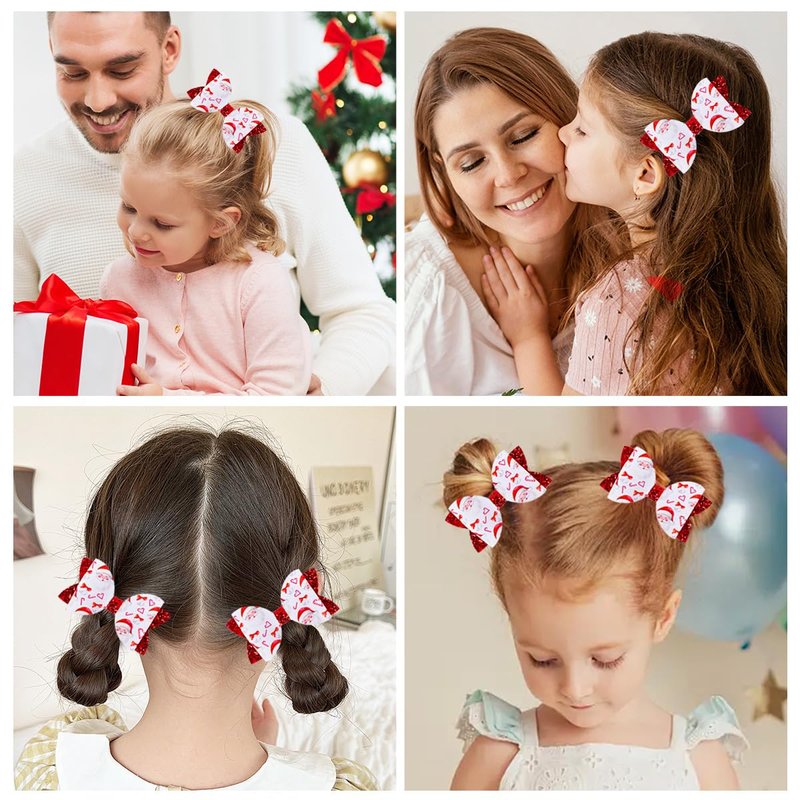 - 🎄 Christmas Sparkle & Cheer : Celebrate the Season! These festive hair bows are designed with classic Christmas icons like Santa Claus and candy canes, with cheerful red glitter for an eye-catching look at any holiday gathering . Perfect for Christmas, birthdays, or party styles, making your pretty girls stand out!