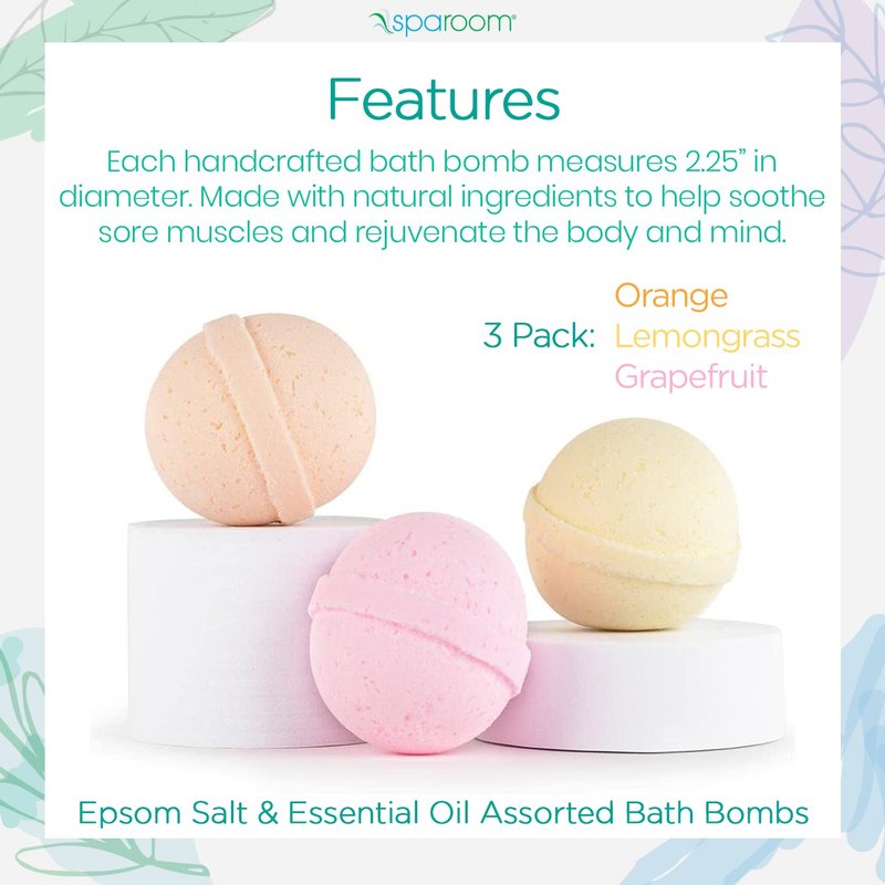 SpaRoom Soothe and Relax Handmade Natural Essential Oil Aromatherapy Bath Bombs, Set of 3, Orange, Lemongrass and Grapefruit